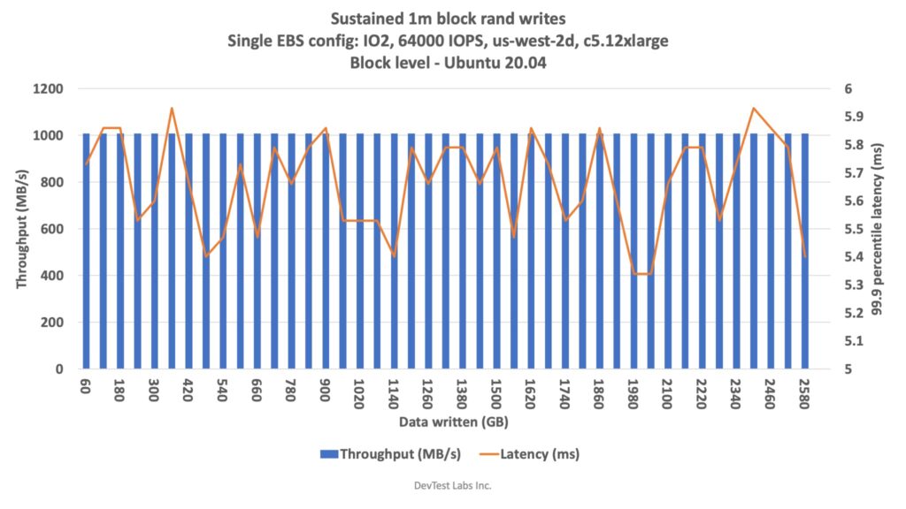 - We wrote up to 5TB of data to benchmark sustained writes. Throughput seems to sustain at 1000 MB/s with slight fluctuation in latency which is acceptable. We thought 5TB is reasonable for sustained test. Results might change when writing much more data than this.