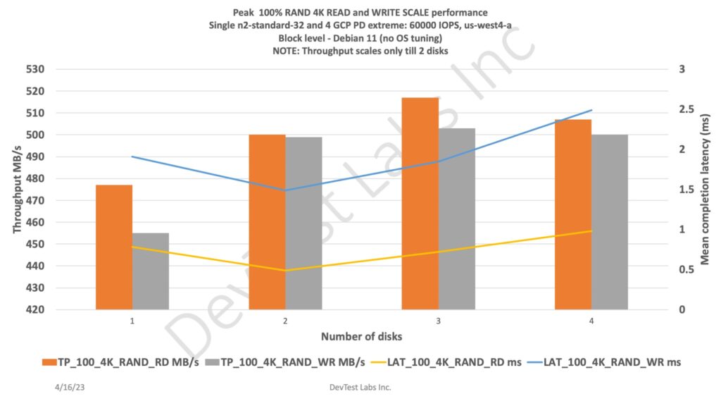 - We found scaling only with 4K and 8K block size workloads and only with 2-3 disks, adding 4th disk do not help. I think we are bumping into per instance storage IOPS limit.