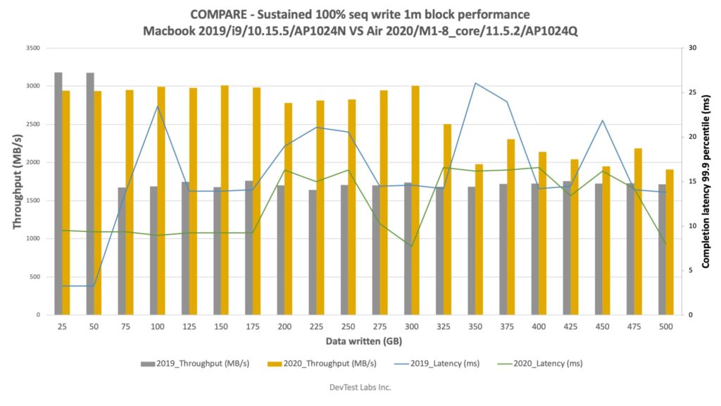 - Sustained write performance is lot better in 2020 model. Even we updated to 11.5.2 in 2019/i9 model sustained writes are lower in 2019 model. We suspect new SSD controller/firmware in 2020 model made this difference.