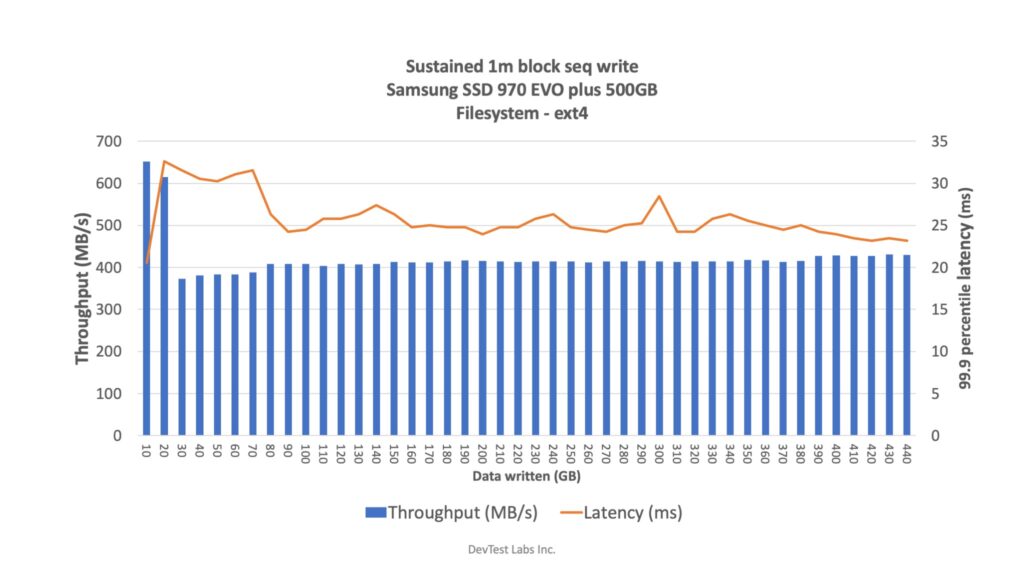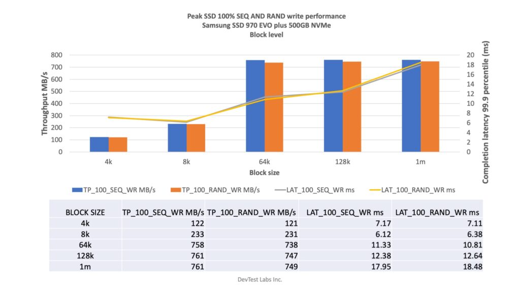 - Used direct IO and/or sync to avoid cache. Most of the benchmarks done with block level (except sustained write, see last image).
