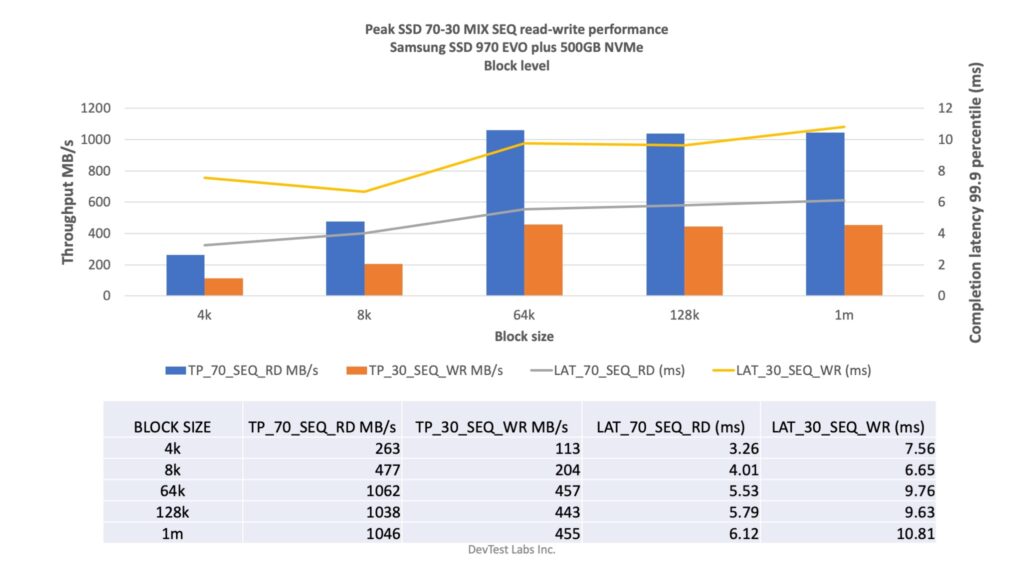- We tried 100% sequential/random read and write, 70-30 read/write mix for sequential and random and sustained 100% write with 1m block size.